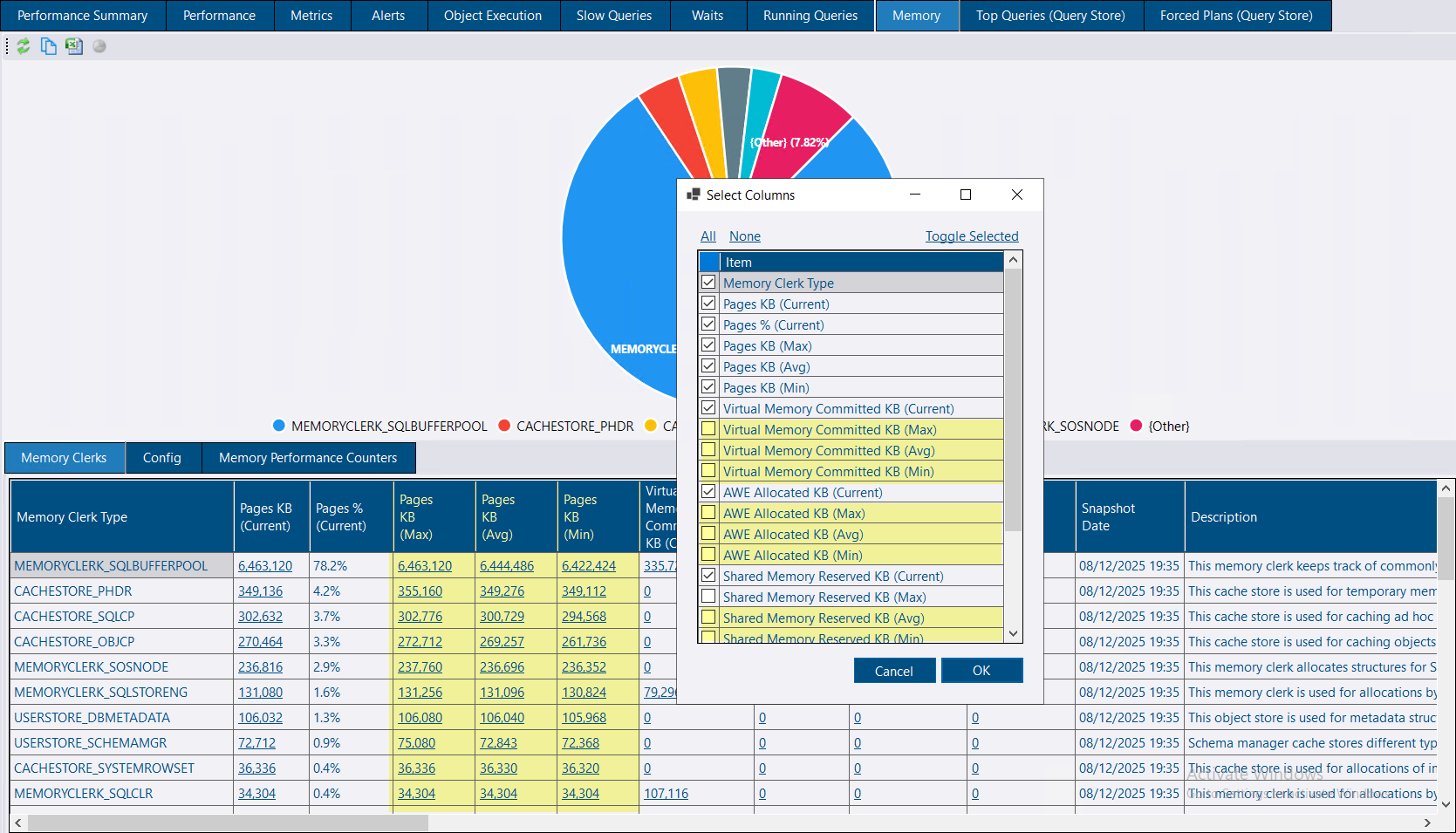The Memory tab now displays maximum, average, and minimum values alongside current readings. This historical view makes it easy to identify memory clerk issues that occurred during your selected time range, even if they’re not currently active.