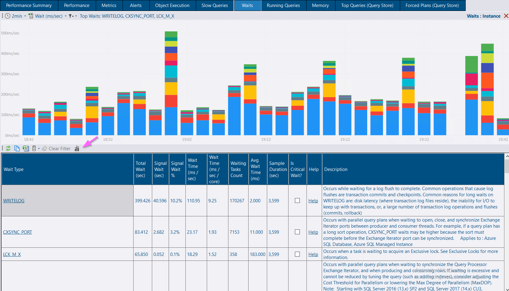 The Waits tab now includes the waits bar chart, previously only available on the Performance tab. This consolidates all wait analysis tools in one location for a streamlined troubleshooting workflow.