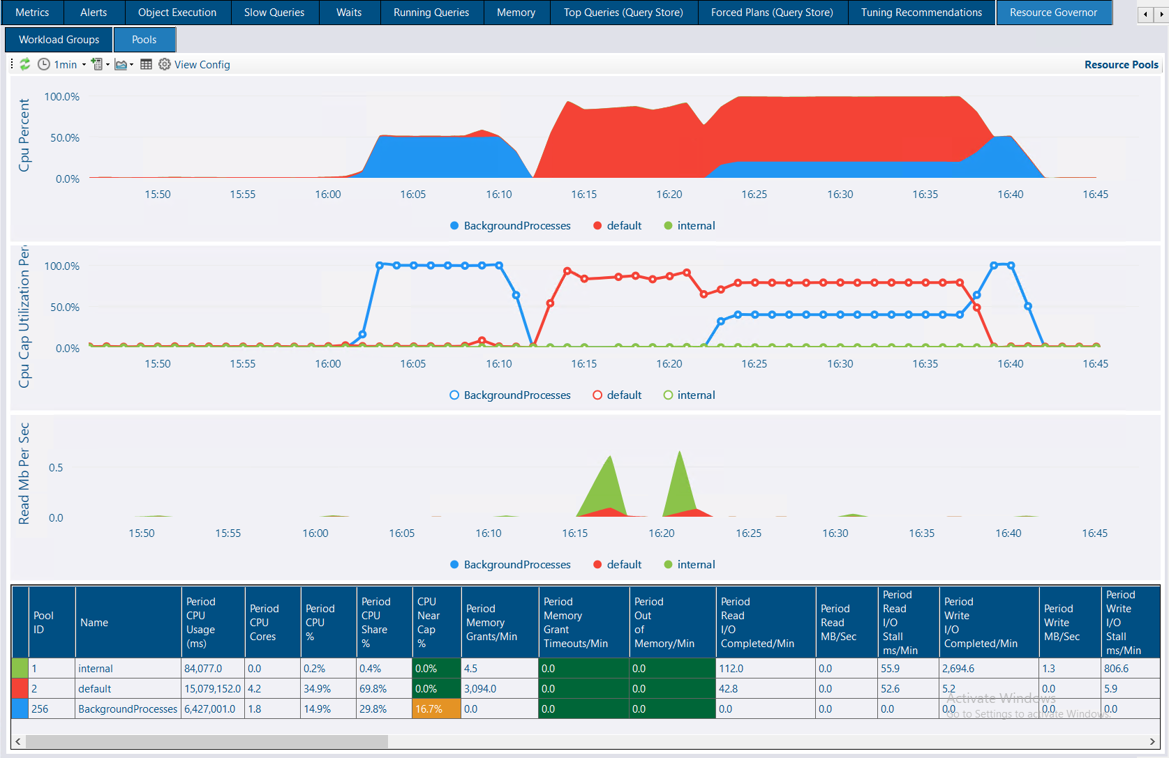 The resource pool chart below shows the same data as the workload groups chart, but summarized at the pool level. The CPU cap utilization percent chart makes it more obvious that we are hitting 100% of the available CPU cap (50%) for the BackgroundProcesses pool.