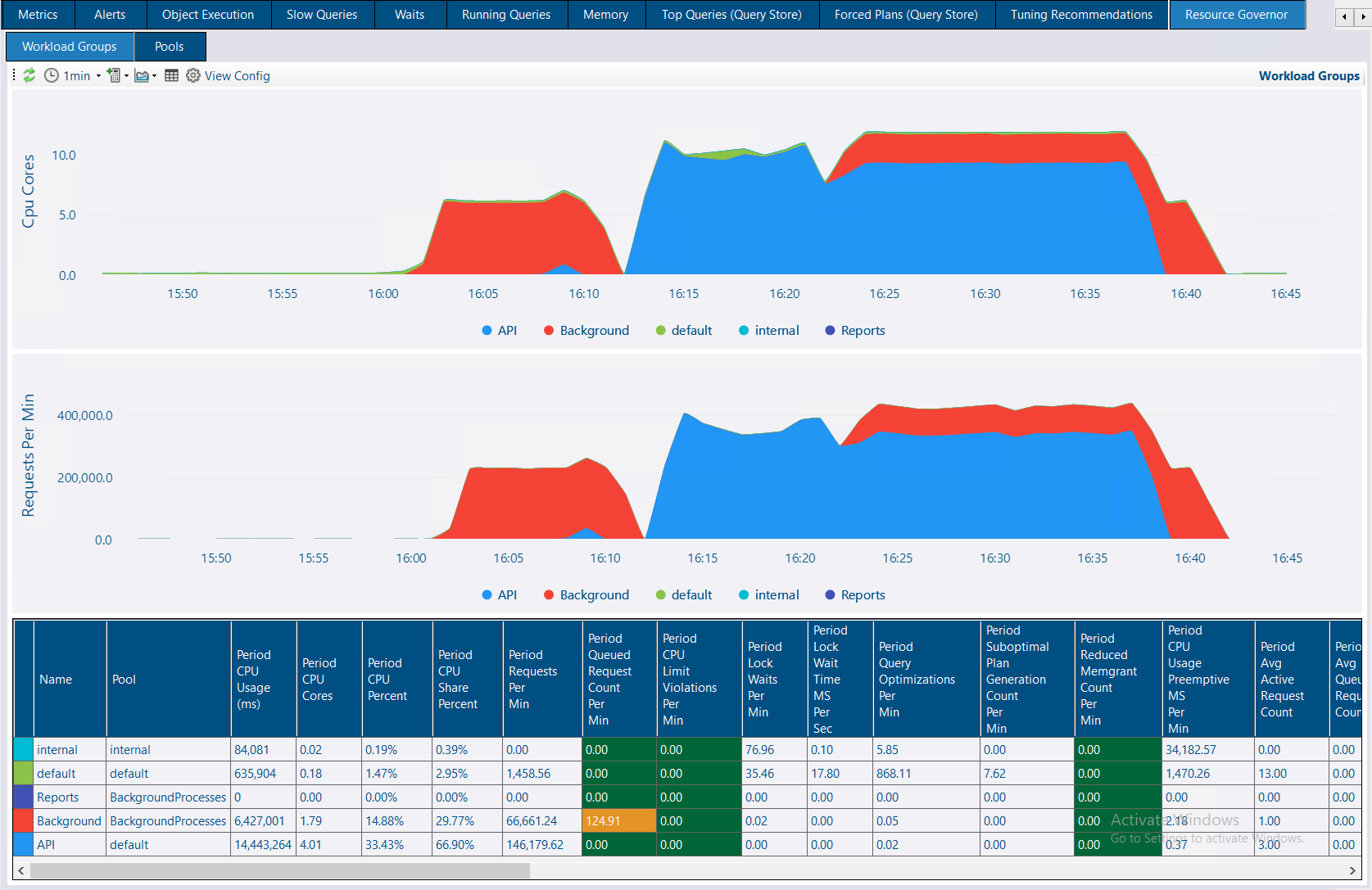 The group max requests is set to 20 which means a max of 20 simultaneous requests can run. The period queued request count per min column highlights when this limit is exceeded and requests are being queued. The API workload group (🔵Blue) maps to the default workload group which doesn’t have any CPU constraints.