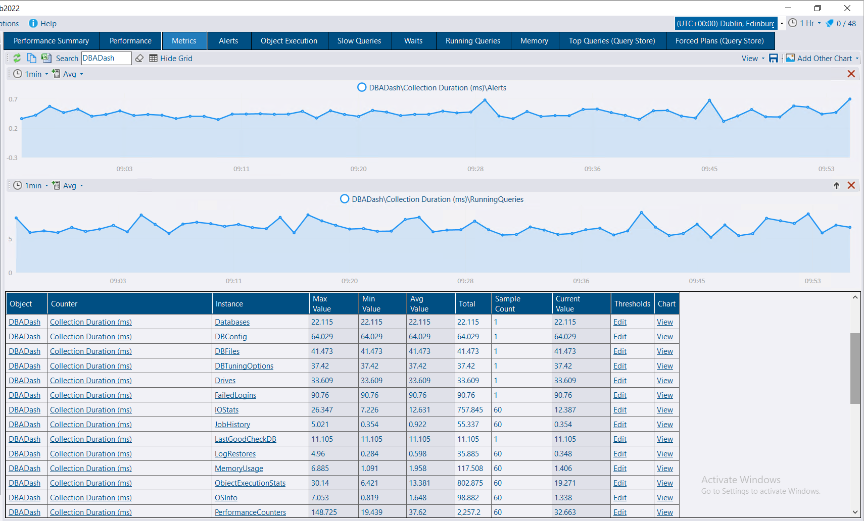 GOIn the Options tab of the service config tool, there is a checkbox for logging internal performance counters. If enabled you will be able to track each collection duration on the Metrics tab. The XE sessions can be a better option as they allow you track how much CPU and IO each collection is using which can be more important than the duration. If you enable internal metrics, it will increase the size of the PerformanceCounters/PerformanceCounters_60MIN tables in the repository database.
